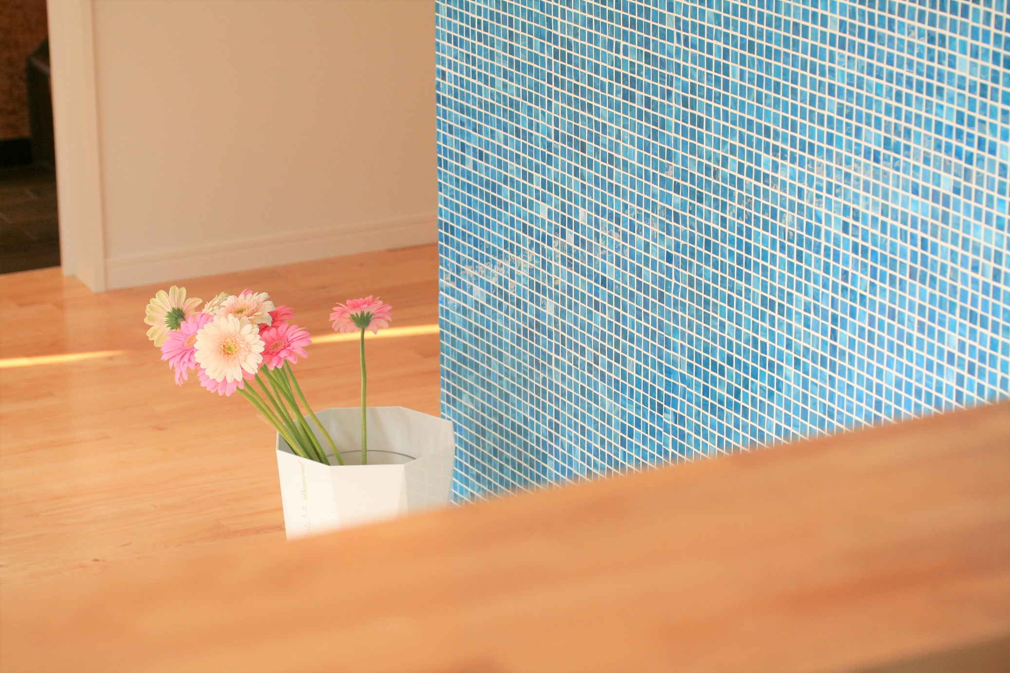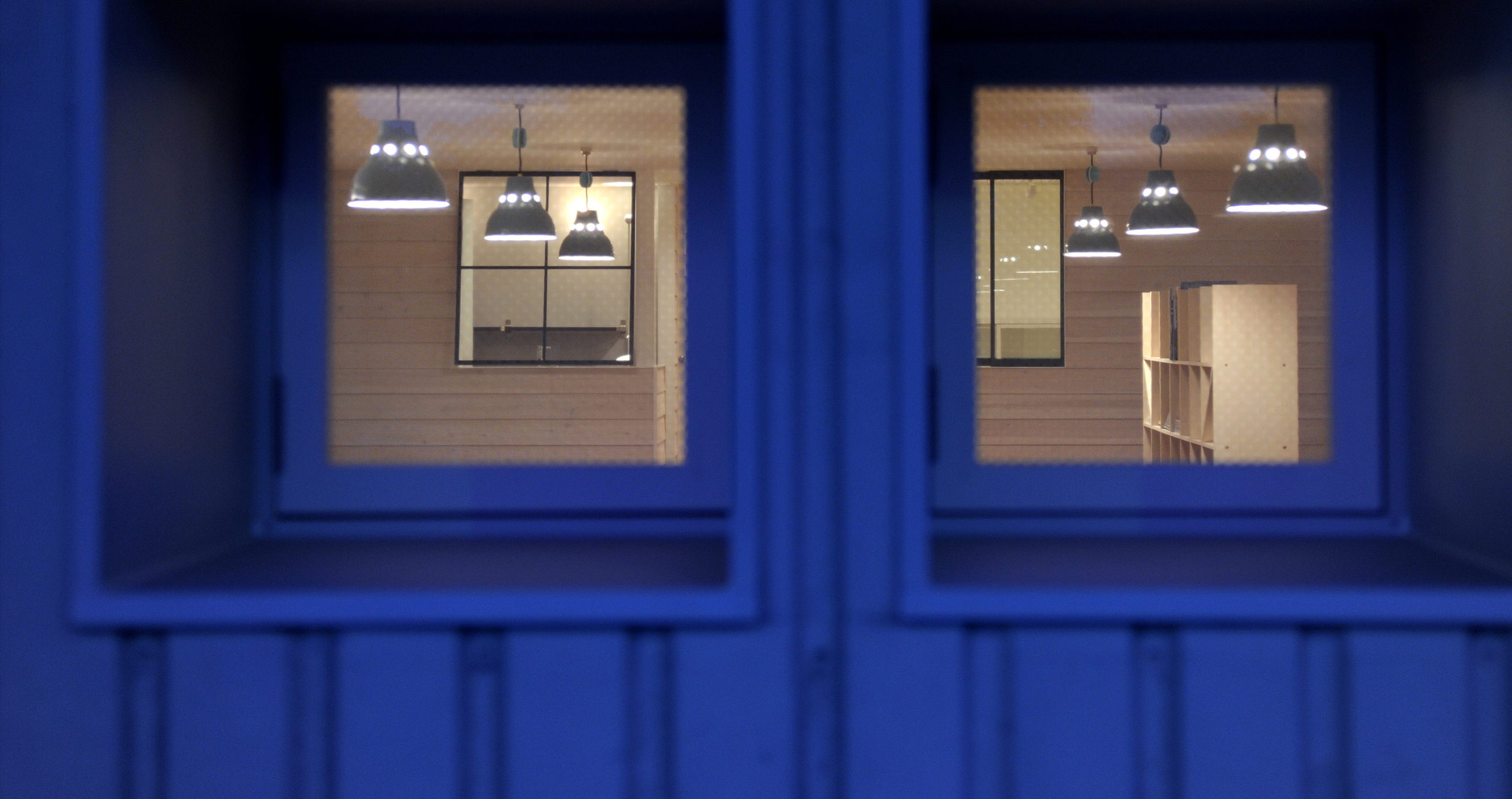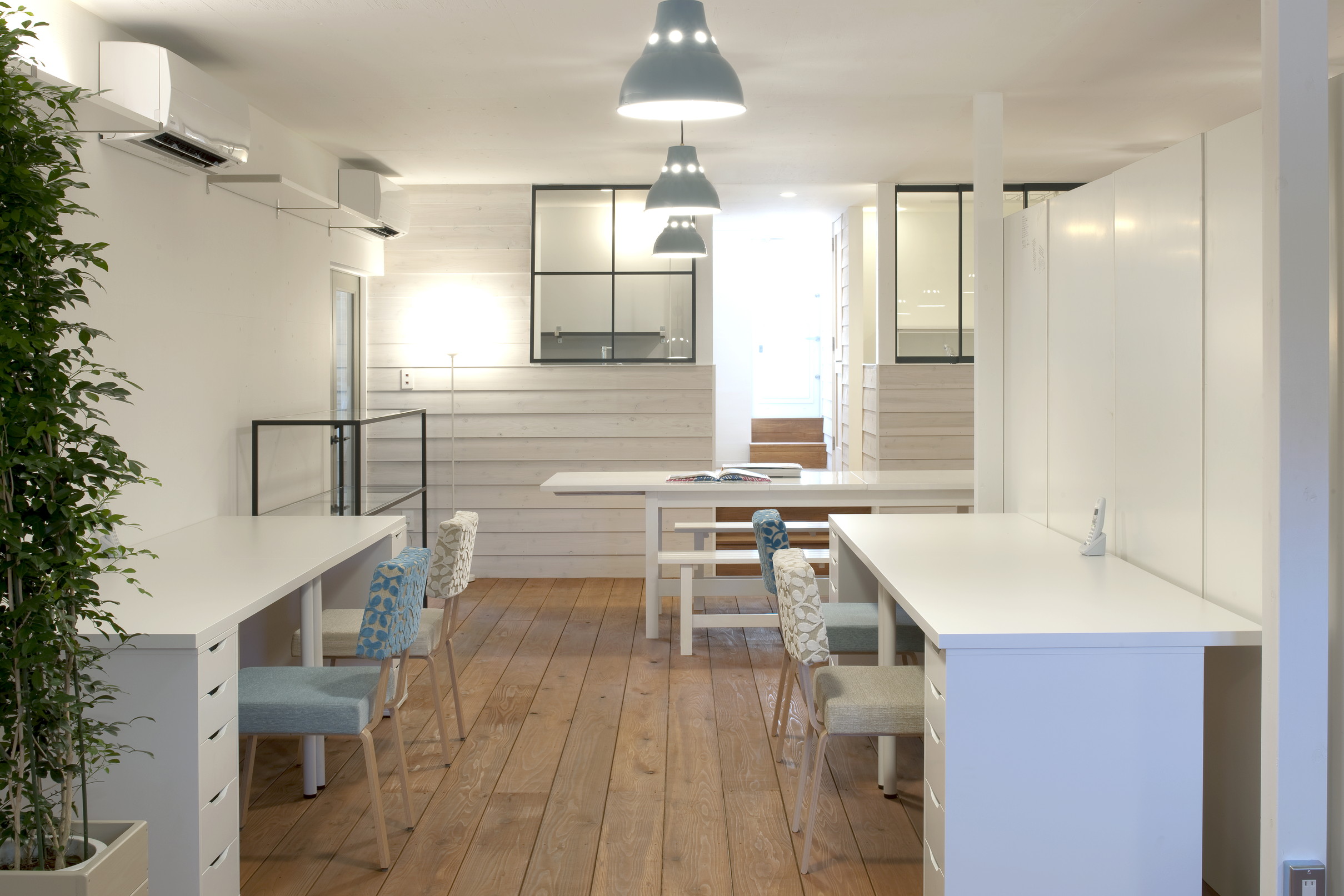 心理的に落ち着く水色の内部空間と、執務空間を隔てるホワイトの無機質な異形鉄筋。熱量を交換し増幅できるインタラクティブな鉄筋の壁が、組織のモチベーションを上げる役割を担うことを期待している。